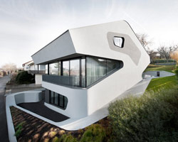 a hillside home in suburban stuttgart seeks to maximize views of a nearby valley with a composition of filleted corners and sweeping curves.
