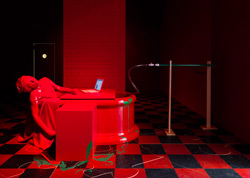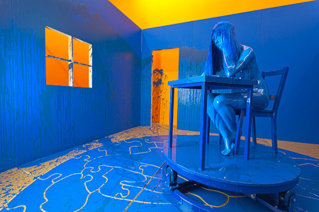 With La Grande Jatte (after Georges Seurat), for example, the artist recreates the 1886–86 pointillist masterpiece by dipping pellets into paint and firing them from a pellet gun at the canvas. Jackson began the project in 1992 and after approximately 90,000 shots the work is barely 10% completed. No matter how much labor Jackson applies to its production, the painting will never be completed. Jackson's Painting with Two Balls (1997) co-opts Johns’ famous 1960 critique of abstract expressionism to make a massive “action” painting by using a Ford Pinto to power two large spinning balls that throw paint in all directions into a large room. The Laundry Room (Death of Marat), 2009, transforms David’s 1793 pieta of the French Revolution into a three-dimensional, life-size mis-en-scene that viewers may enter. Like The Laundry Room, Jackson’s The Blue Room (2011) also turns a painting into a sculpture that makes a painting; in this case using Picasso’s 1901 The Blue Room (The Tub) for inspiration.