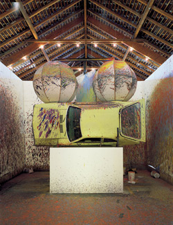 Richard Jackson, "Painting with Two Balls," 1997, Ford Pinto, metal, wood, canvas, acrylic paint, 240 1/8 x 43 1/4 x 240 1/8".