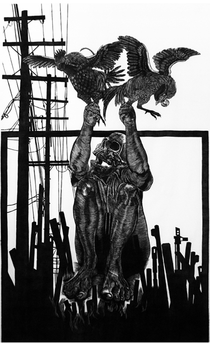 The woodcut is glorious; a ravishing image of skeletal figure holding up two battling roosters, their feathered bodies rippling with finely cut texture. The thousands of grooves cut into the original wood block provide elegant testimony to Alejandre’s laborious — and yet joyous — process.