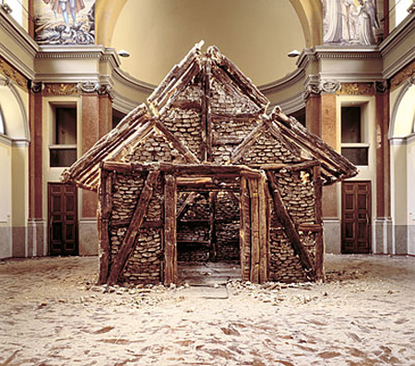 Urs Fischer, ''Untitled (Bread House),'' 2004-05, bread, bread crumbs, wood, polyurethane foam, silicone, acrylic paint, screws, tape, rugs, theater spotlights, 159 7/8 x 146 1/2 x 165 3/4''.