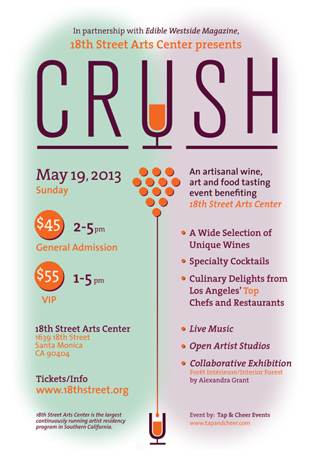 18th Street Arts Center is calling all urban foodies, wine loving enthusiasts and art aficionados for its benefit event CRUSH, on May 19, 2013. Held in the heart of Santa Monica, CRUSH celebrates the best of locally produced art, food and music along with a selection of fine wines. With a variety of small bites from 10 restaurants and trend-setting chefs, 2 Master Chef Finalists, 12 award-winning wineries, a leading sommelier, specialty cocktails of fine spirits, live music, a collaborative exhibition and open artist studios as well as Crash Courses to educate, CRUSH is well-poised to provide attendees with a delightful, engaging cultural experience.